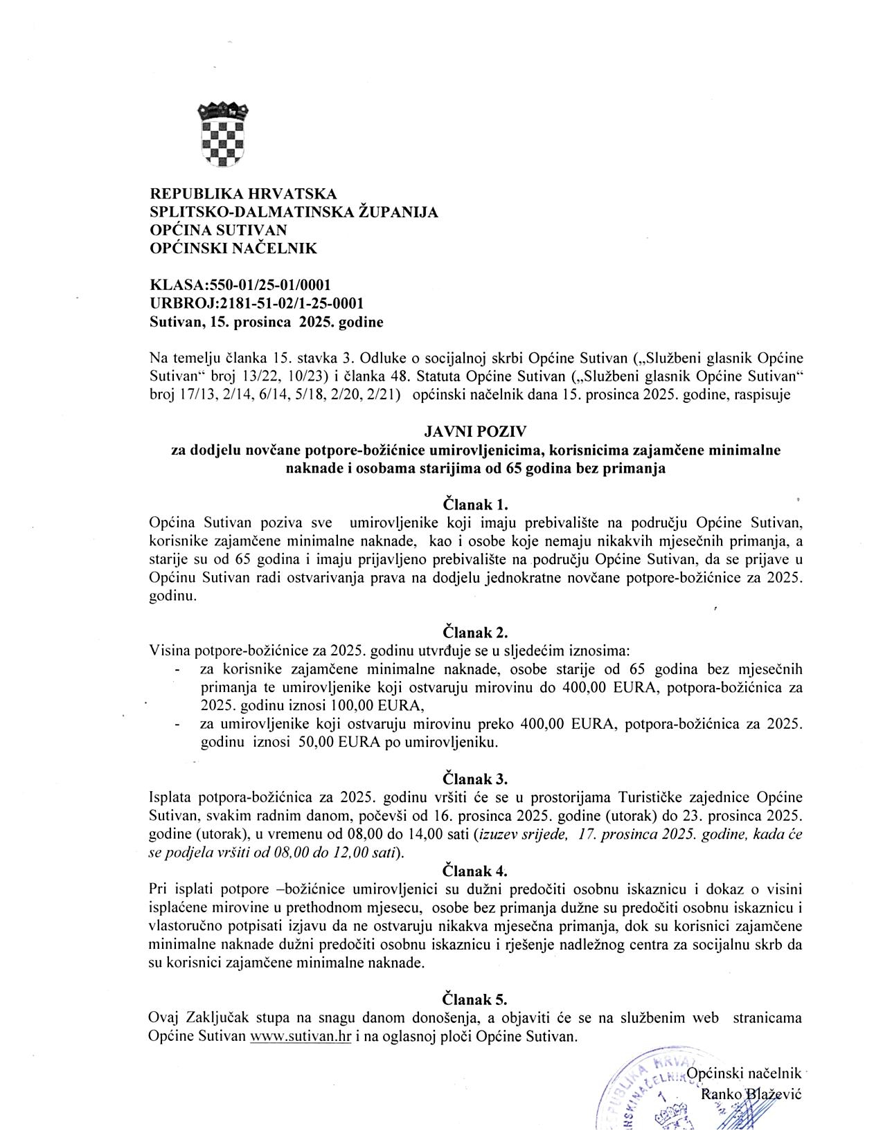 Općina Sutivan poziva sve umirovljenike koji imaju prebivalište na području Općine Sutivan, korisnike zajamčene minimalne naknade, kao i osobe koje nemaju nikakvih mjesečnih primanja, a starije su od 65 godina i imaju prijavljeno prebivalište na području Općine Sutivan, da se prijave u Općinu Sutivan radi ostvarivanja prava na dodjelu jednokratne novčane potpore-božićnice za 2025. godinu.